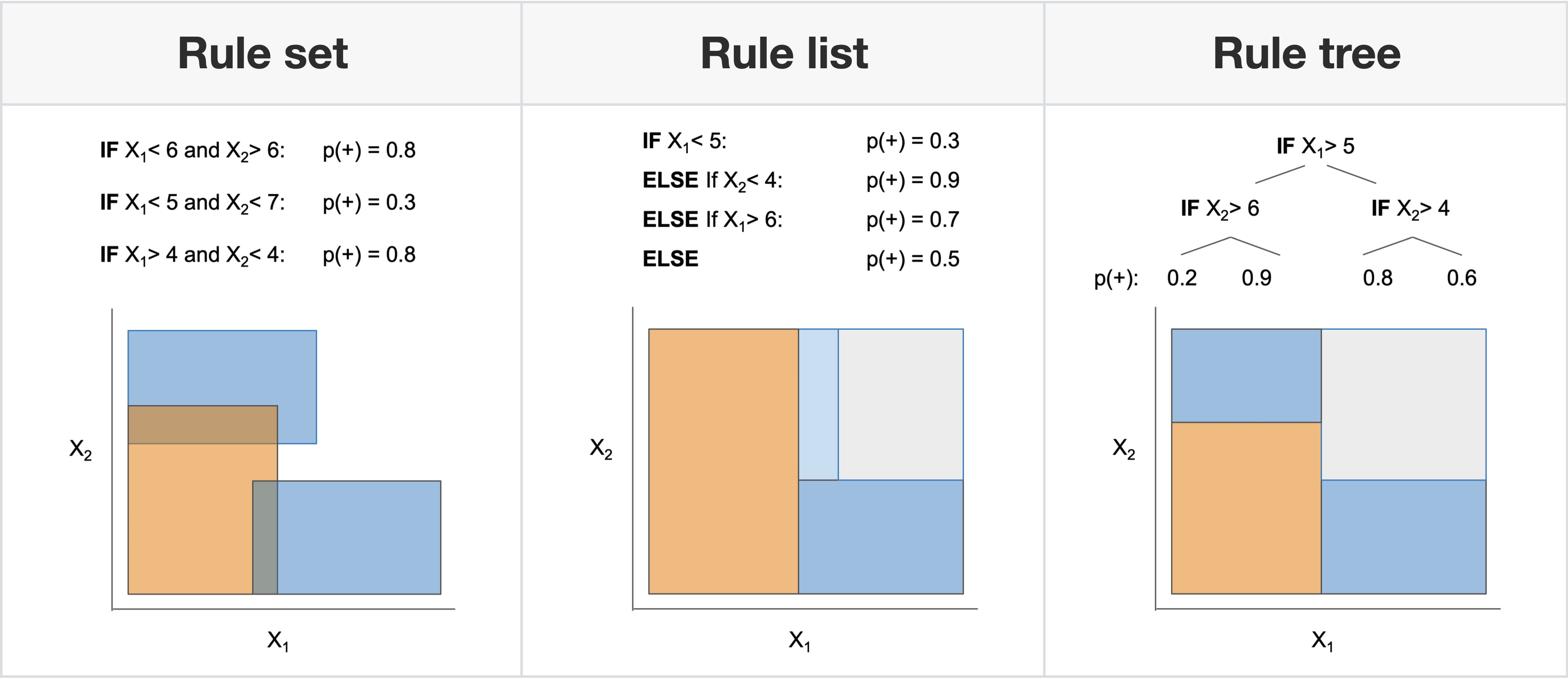 The rule-based models take slightly different forms (see below), but all try to optimize predictive performance using as few rules as possible. See the imodels package for more details.